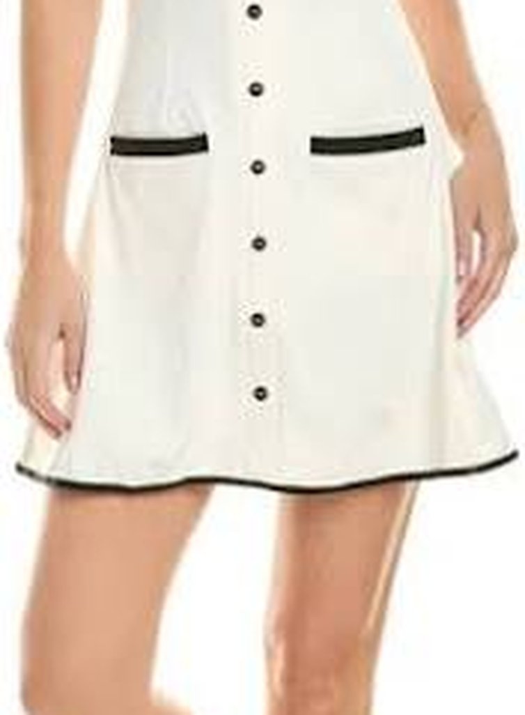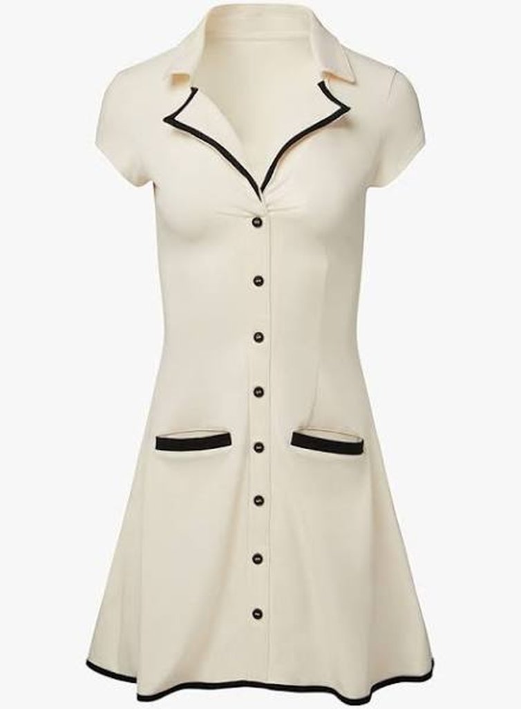 Details: Collared mini silhouette, contrast piping and buttons, fitted bodice