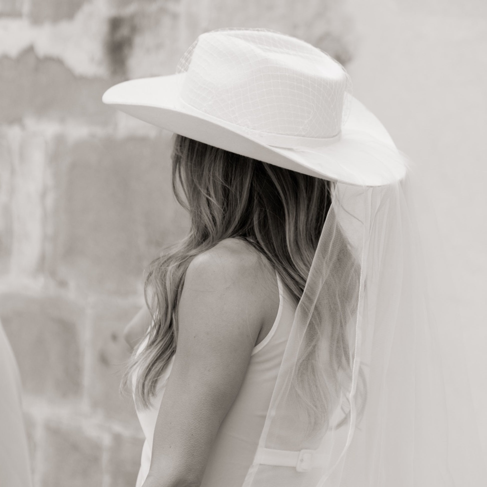 Romantic, playful, and effortlessly chic — the Wyeth Tulle Rancher brings a touch of whimsy to any bridal look. Crafted from soft wool and adorned with delicate tulle that doubles as a veil, this modern cowgirl hat is made for brides who love a little drama with their “I do.”
