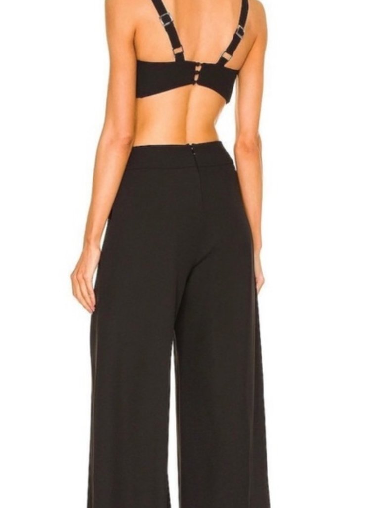 A sleek and sculptural take on eveningwear, this black tailored jumpsuit by PatBo features a flattering wide-leg silhouette, mid-rise waist cutout, and criss-cross neckline accented with gold barbell and pearl hardware. Adjustable straps and side pockets complete this effortlessly cool statement piece.
